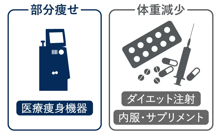 部分痩せと体重減少に役立つ2タイプの治療を導入しています。部分痩せが可能なタイプは、脂肪細胞そのものを減少させます。この施術は皮下脂肪に直接変化をもたらすものになります。体重減少に役立つタイプは、肥満の原因に直接アプローチします。体重減少が主な目的で内臓脂肪の減少にもつながります。目的の異なる治療を取り入れることで、効率的な痩身が可能です。