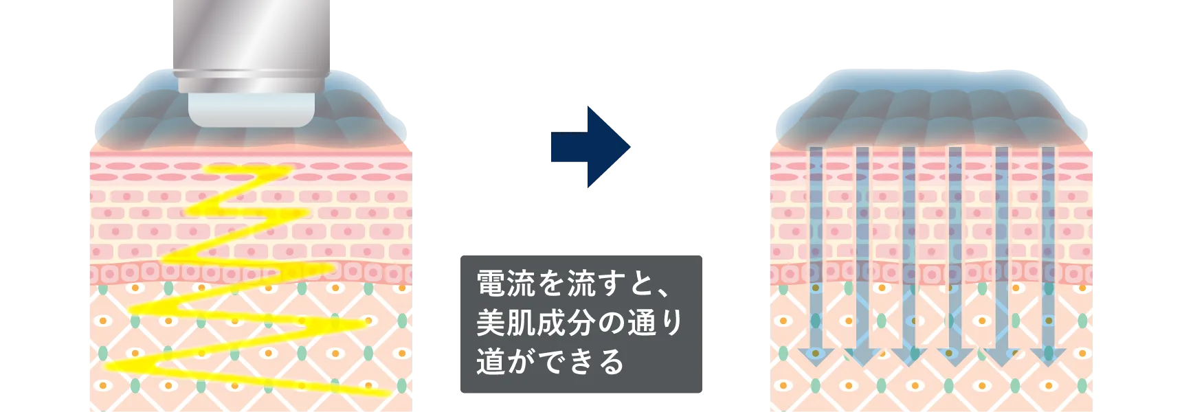 エレクトロポレーションは肌に微弱な電流を流し、一時的に細胞間に孔を開け、美容成分を肌の奥深くまで浸透させる画期的な施術です。