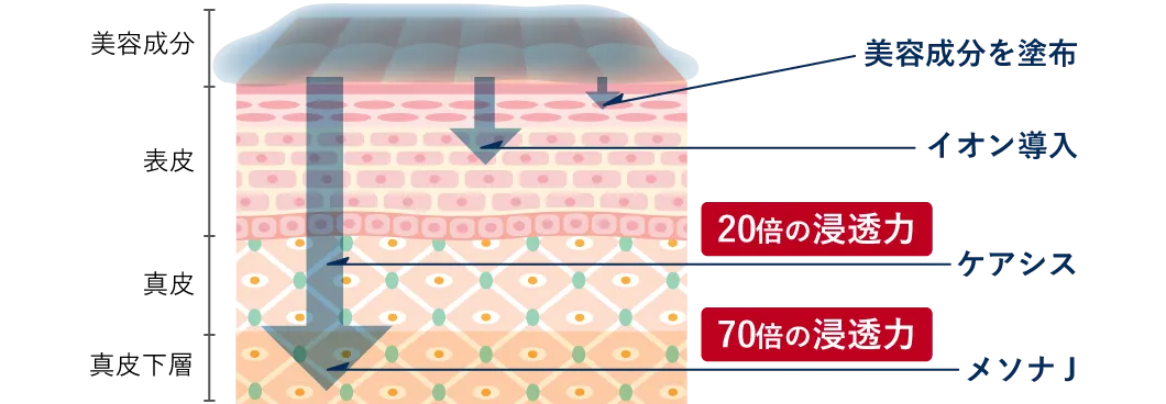患者様のお悩みに合わせて、美白・美肌成分やニキビ改善、毛穴改善、小ジワ改善、肝斑改善などの有効成分を肌深層部までダイレクトに浸透させることが可能です。当院で導入しているエレクトロポレーション「ケアシス」「メソナJ」は、美容製剤を直接塗るだけに比べて約1,000倍もの導入効果が得られます。