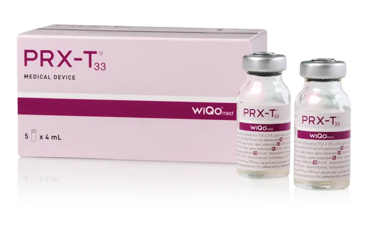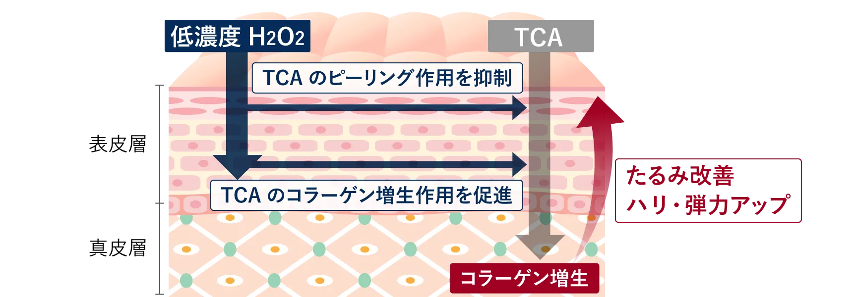 マッサージピール(PRX-T33)に含まれるH₂O₂(過酸化水素)とTCA(トリクロロ酢酸)、2つの物質は、肌に塗布後、それぞれ異なるスピードで皮膚のバリアを通過し、異なる深さまで到達します。H₂O₂は、表皮の表層細胞との親和性が高いので、浅く素早く浸透していきます。またTCAの水素イオンは、表皮や真皮といった深い層まで浸透していきます。そして水素イオンは表皮層においてH₂O₂との化学反応で水になり、これによりTCAの強いピーリングの作用が抑制されます。表層で化学反応しなかった水素イオンは、皮膚を通過して真皮に達し、細胞の再生や新たなコラーゲンの生成促進をしてくれますのでハリ・ツヤ、小じわのケアにも効果的です。