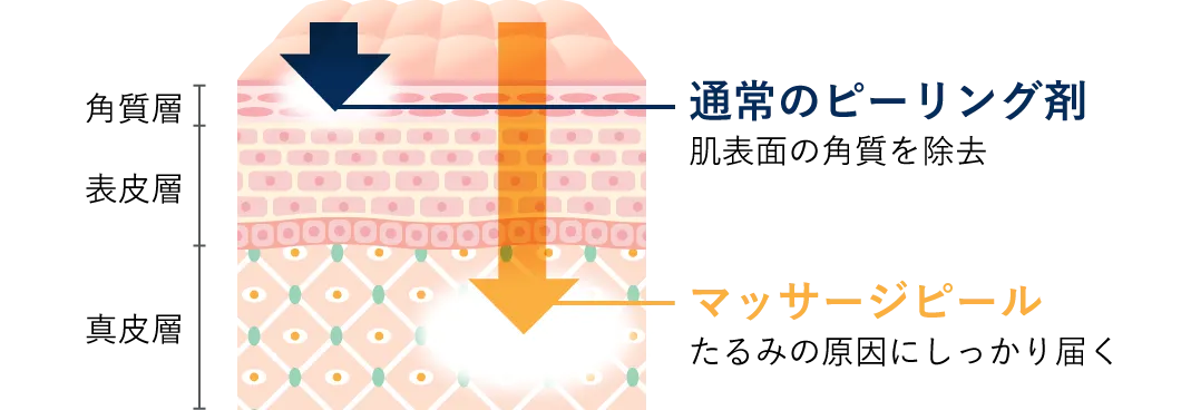従来のピーリングは、肌表面(角質層)に作用して古い角質を除去し、ターンオーバーを整える効果があります。一方マッサージピールは、肌の奥深く(真皮層)まで浸透し、肌の若々しさの維持に必要不可欠なコラーゲンの増生を強力に促します。たるみの改善にも一躍を担う今までのピーリングとは一線を画した優れた治療です。また、マッサージピールは光感作(光が当たると化学変化を起こすこと)がないため、紫外線の強い時期でも施術が可能です。