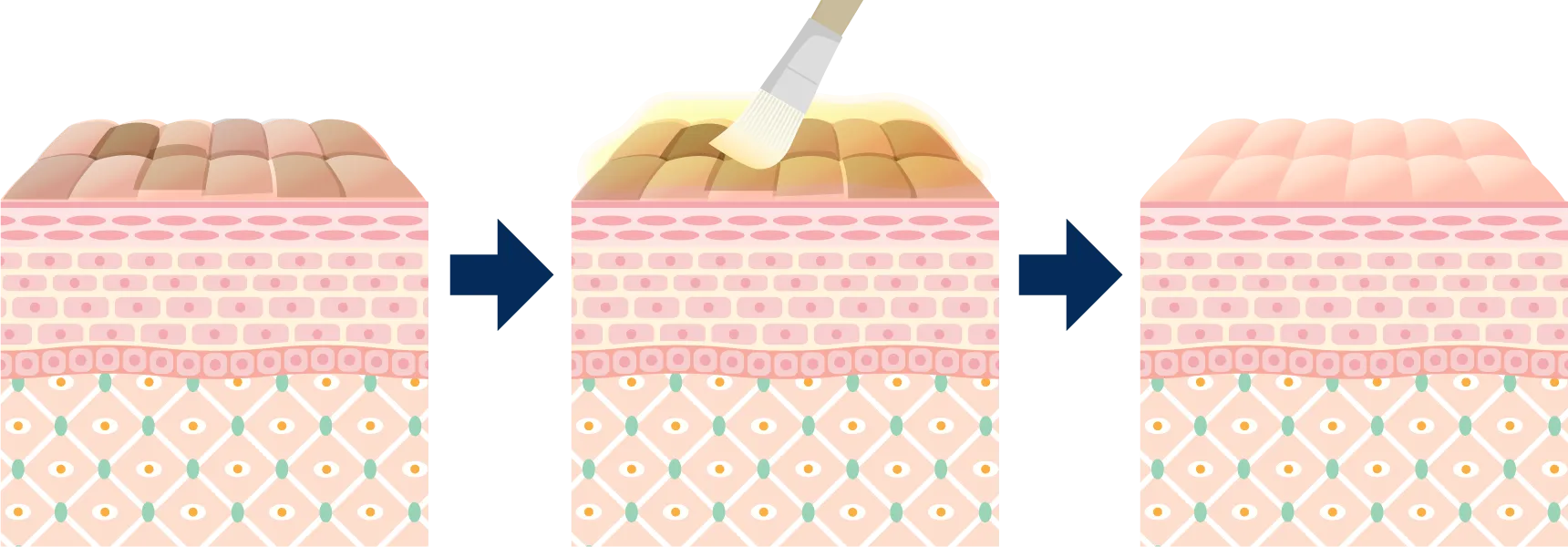 ケミカルピーリングは、薬剤を肌に塗布し、古い角質を取り除き、肌の細胞が一定の周期で生まれ変わる仕組み(ターンオーバー)を取り戻す施術です。また、角質内のシミ改善にも効果が見込まれます。