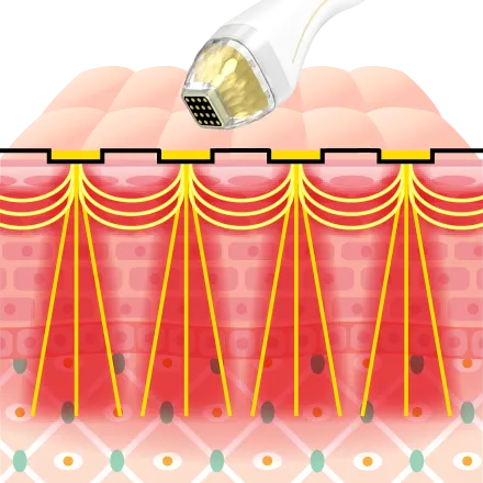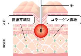 高周波(RF)の熱照射によって肌細胞(線維芽細胞)が活性化され、さらに極細針によってできた肌の傷には、自然な創傷治癒効果が働きます。通常のマイクロニードル治療以上の高い効果が期待できます。