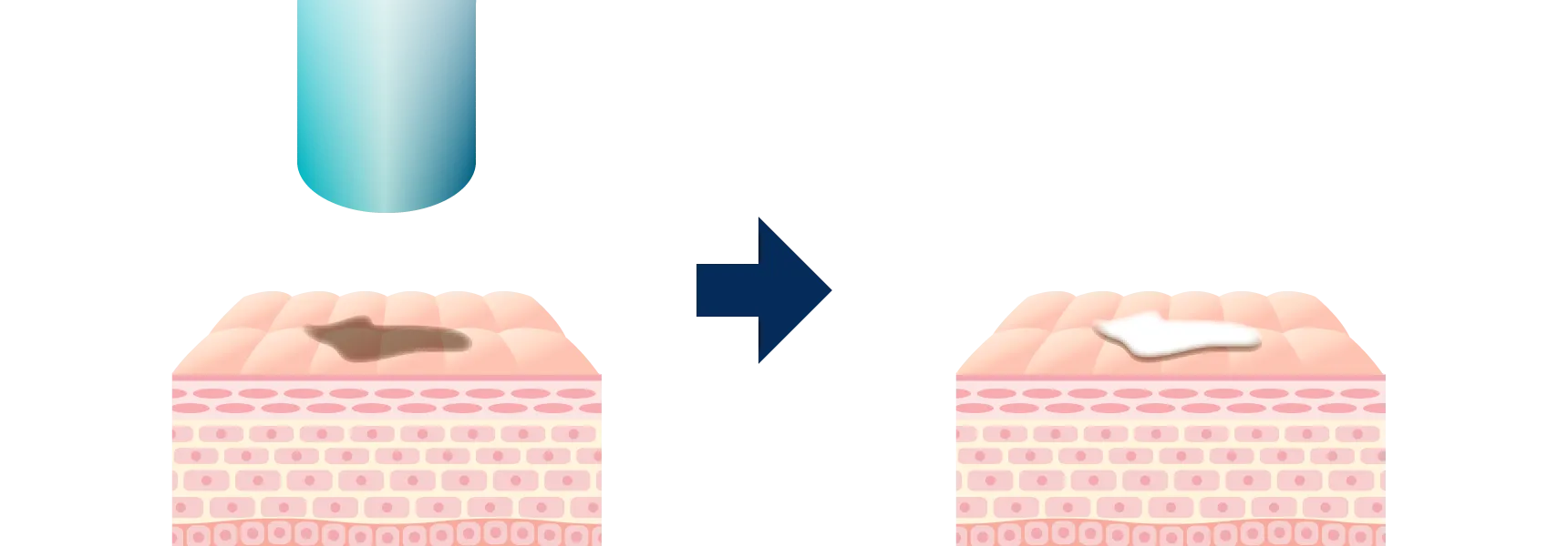 深くて濃い黒色の色素から薄い色素まで、鋭くシミに直接アプローチすることが可能なため、少ない施術回数でシミ取り治療が完了できることが特長とメリットです。