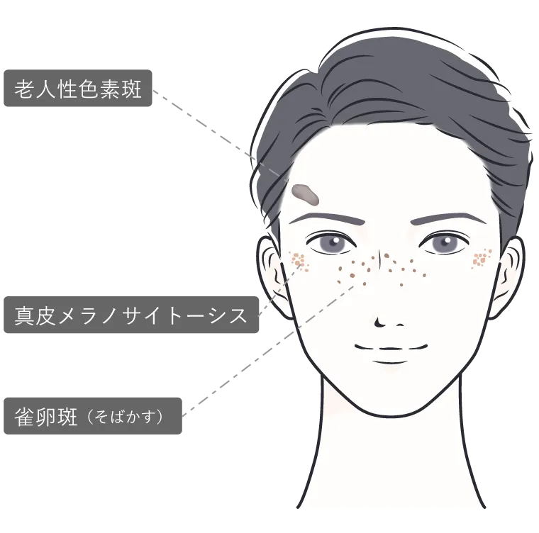 男性に多いシミ・そばかすとそれぞれに応じた治療法をご用意しています。Qスイッチルビーレーザーは紫外線によるシミは、ほぼ一回でキレイにします。