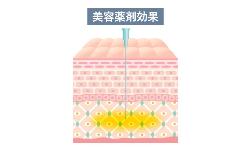 注射は、有効成分(スキンブースター)を真皮へ直接届け、コラーゲンやエラスチンの生成をサポート。肌質そのものを整え、自然なハリとツヤを引き出します。