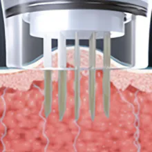 ポテンツァは、新世代高周波フラクショナル治療器です。微細なマイクロニードルを皮膚に挿入し、その先端から高周波を放出。このプロセスで真皮層に熱エネルギーを供給し、肌本来の修復機構を活性化させます。