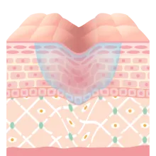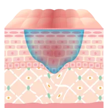 ドラッグデリバリーシステムを利用し、ジュベルックを導入します。ジュベルックは、ポリ乳酸(PDLLA)を主成分とする生体刺激性フィラーで、体内に注入されると1~2年かけて水と二酸化炭素に分解されます。皮下に注入されたジュベルックは、分解されるまでの期間にわたり真皮層を持続的に刺激し、コラーゲンやエラスチンの生成を活性化します。その結果、肌のハリやツヤ、弾力が向上し、毛穴の開きや小ジワ、ニキビ跡を改善します。
